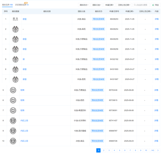 不过,需要提及的是,2025年12月27日,天眼查显示,“朕皇”和“内廷上用”的商标状态为“等待实质审查”。