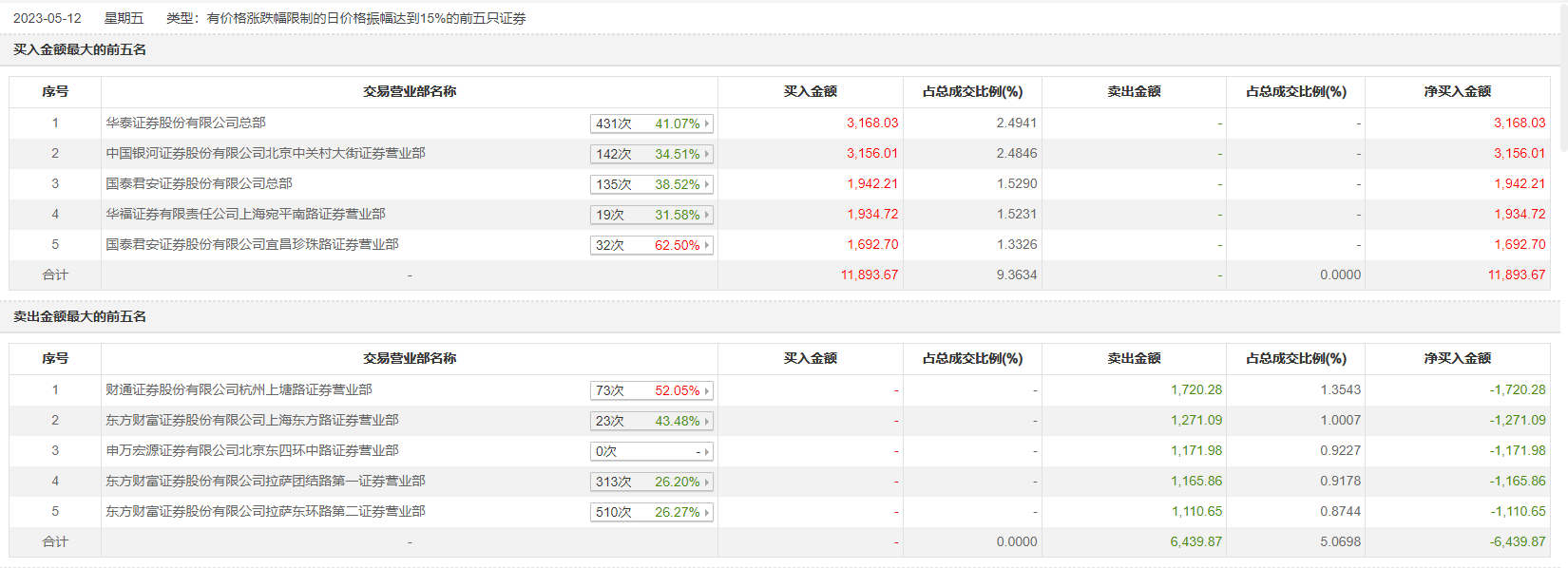 具体来看,华泰证券总部、中国银河证券北京中关村大街证券营业部分别买入3168.03万元、3156.01万元;财通证券杭州上塘路证券营业部、东方财富证券上海东方路证券营业部分别卖出1720.28万元、1271.09万元。