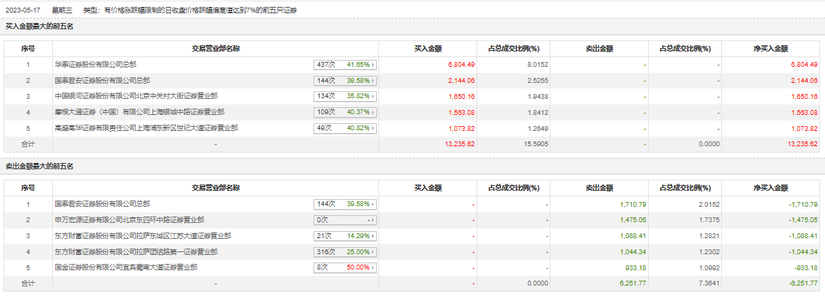 具体来看,国泰君安证券总部、申万宏源证券有限公司北京东四环中路证券营业部分别卖出1710.79万元、1475.05万元;华泰证券总部、国泰君安证券总部分别买入6804.49万元、2144.06万元。