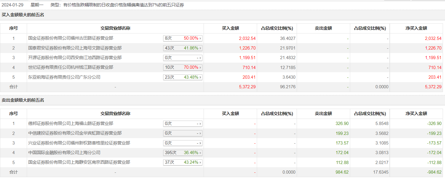 中视传媒1月29日涨停,全天换手率达0.65%,振幅达0%。龙虎榜数据显示,营业部席位合计净买入4387.67万元。其中,国金证券福州古田路证券营业部、国泰君安证券上海号文路证券营业部分别买入2032.54万元、1226.70万元;德邦证券上海福山路证券营业部、中信建投证券金华宾虹路证券营业部分别卖出326.90万元、199.23万元。