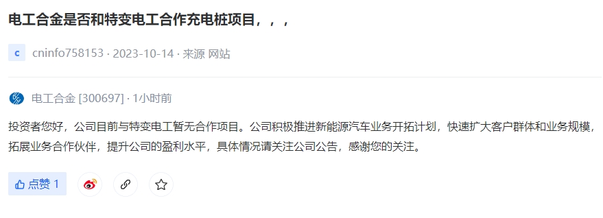 中国财富通10月16日 - 电工合金(300697)在互动平台上表示,公司目前与特变电工暂无合作项目。公司积极推进新能源汽车业务开拓计划,快速扩大客户群体和业务规模,拓展业务合作伙伴,提升公司的盈利水平。