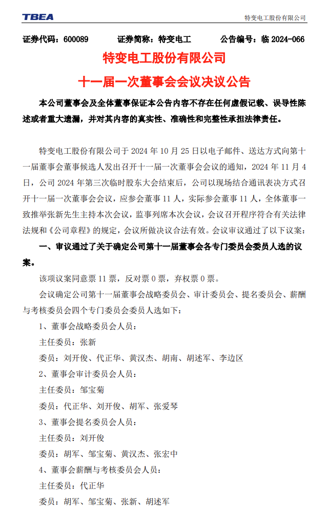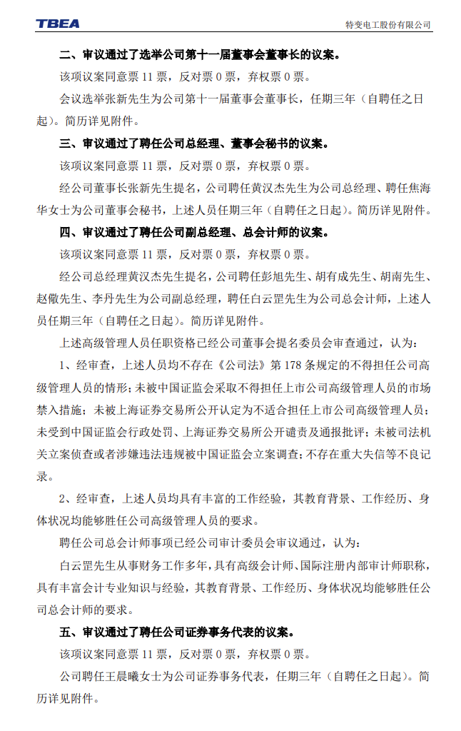 中国风电新闻网讯:11月4日,特变电工发布十一届一次董事会会议决议公告。公告指出,会议审议通过了聘任彭旭先生为公司副总经理的议案。