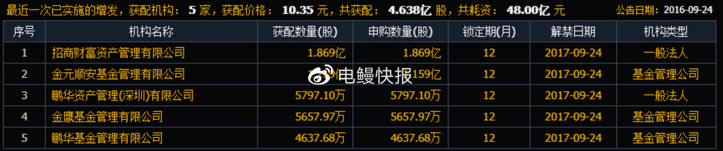 其中,招商财富资产管理有限公司认购金额为19.34亿元;金元顺安基金管理有限公司认购约12亿元;鹏华资产管理(深圳)有限公司、金鹰基金管理有限公司、鹏华基金管理有限公司分别认购约6亿元、5.86亿元和4.8亿元。