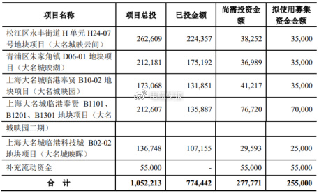据悉,大名城该次向特定对象发行股票的募集资金总额预计为不超过25.5亿元(含本数),扣除发行费用后的募集资金净额将全部用于松江区永丰街道H单元H24-07号地块项目(大名城映云间)、青浦区朱家角镇D06-01 地块项目(大名城映湖)、上海大名城临港奉贤B10-02地块项目(大名城映园)、拟使用募集资金金额3.5亿元;上海大名城临港奉贤B1101、B1201、B1301地块项目(大名城映园二期)拟使用募集资金金额7亿元;补充流动资金拟使用募集资金金额5.5亿元。