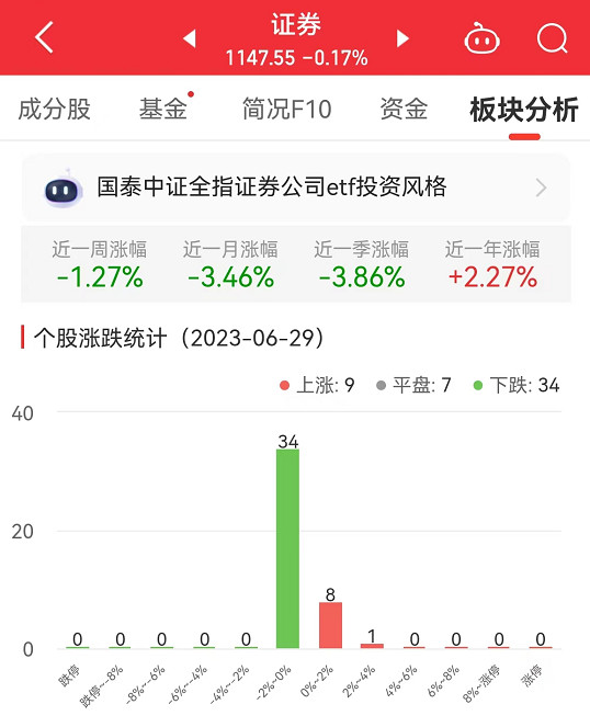 中国经济网北京6月29日讯 今日,证券板块整体跌幅0.17%,其中,9只股票上涨,7只股票平盘,34只股票下跌。