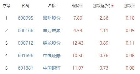 其中,湘财股份、申万宏源、锦龙股份、中银证券、中国银河位列板块涨幅前五位,涨幅分别为2.36%、1.11%、0.89%、0.76%、0.73%。