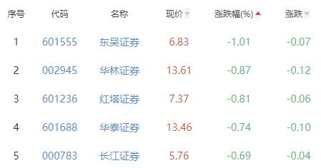 东吴证券、华林证券、红塔证券、华泰证券、长江证券位列涨幅榜后五位,涨幅分别为-1.01%、-0.87%、-0.81%、-0.74%、-0.69%。