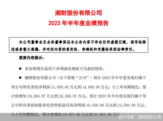 北京商报讯(记者 刘宇阳 郝彦)7月13日,湘财股份发布半年度业绩预告,预计2023年半年度实现归属于母公司所有者的净利润1.1亿元到1.4亿元,与2022年同期-8260.07万元相比,实现同比扭亏为盈。