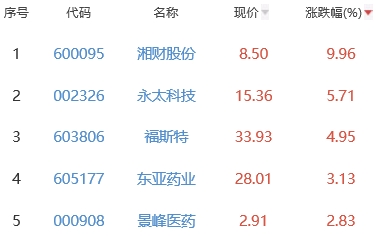 其中,湘财股份、永太科技、福斯特、东亚药业、景峰医药位列板块涨幅前五位,涨幅分别为9.96%、5.71%、4.95%、3.13%、2.83%。