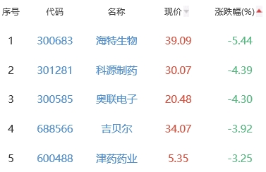海特生物、科源制药、奥联电子、吉贝尔、津药药业位列涨幅榜后五位,涨幅分别为-5.44%、-4.39%、-4.30%、-3.92%、-3.25%。