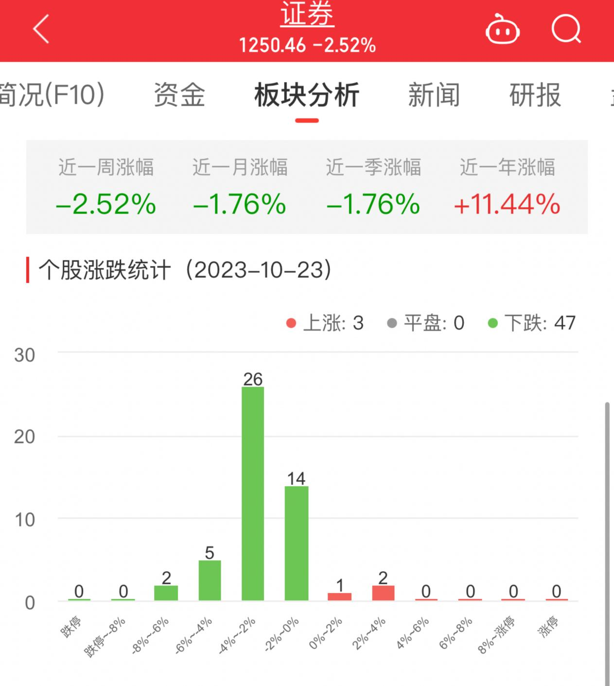 中国经济网北京10月23日讯 今日,证券板块整体跌幅2.52%,其中3只股票上涨,47只股票下跌。