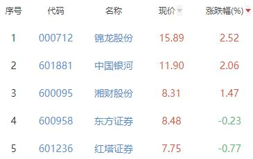 其中,锦龙股份、中国银河、湘财股份、东方证券、红塔证券位列板块涨幅前五位,涨幅分别为2.52%、2.06%、1.47%、-0.23%、-0.77%。