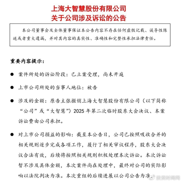 11月11日晚,大智慧公告,原告王功伟于2025年10月15日向上海市浦东新区人民法院提起诉讼,主张撤销该公司2025 年第二次临时股东大会决议。该公司于2025年11月10日收到法院送达的《应诉通知书》。