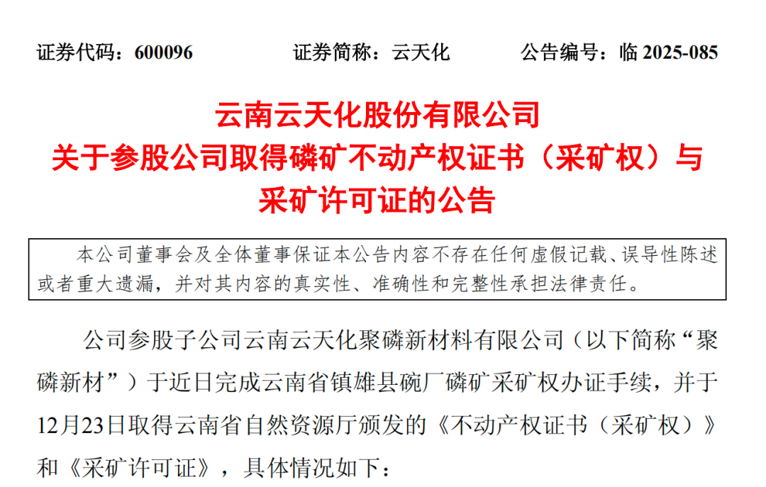 慧正资讯,2025年12月25日,云南云天化股份有限公司公告披露,其参股子公司聚磷新材正式获得云南省镇雄县碗厂磷矿采矿许可证。这一消息不仅让云天化的磷矿储量实现跨越式增长,更将深刻影响国内磷化工行业的竞争格局。