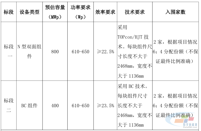 标段一:N型双面组件;预估容量800 MWp;功率要求:610-650Wp;技术要求:采用TOPcon/HJT技术。每块组件尺寸长度不大于2468mm,宽度不大于1136mm。