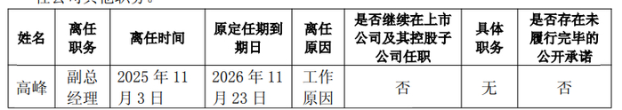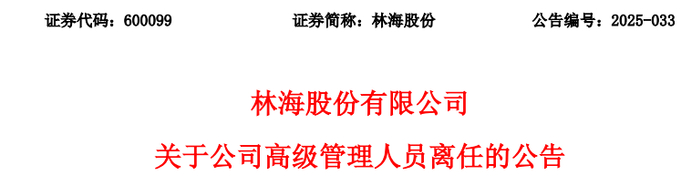 公告显示,林海股份董事会于11月3日收到副总经理高峰的辞职报告。因工作原因,高峰申请辞任该职务,其辞职报告自送达董事会之日起生效,辞任后不再担任公司其他职务。高峰原定任期到2026年11月23日,此次离任后将不在上市公司及其控股子公司任职,也不存在未履行完毕的公开承诺。