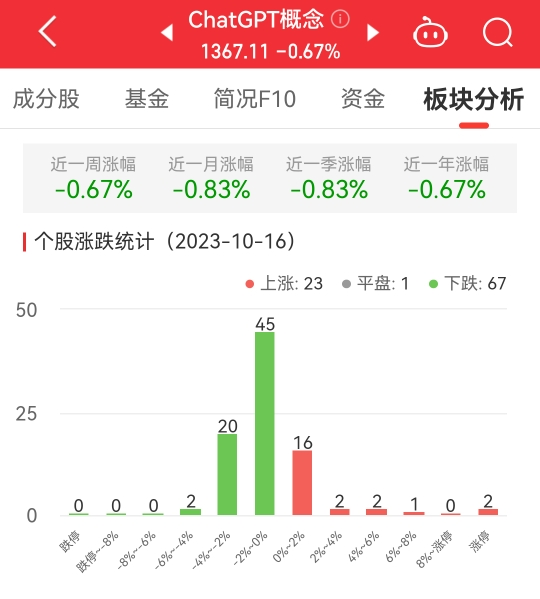 中国经济网北京10月16日讯今日,ChatGPT概念板块整体跌幅0.67%,其中23只股票上涨,1只股票平盘,67只股票下跌。