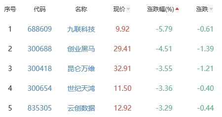 九联科技、创业黑马、昆仑万维、世纪天鸿、云创数据位列涨幅榜后五位,涨幅分别为-5.79%、-4.51%、-3.55%、-3.36%、-3.29%。