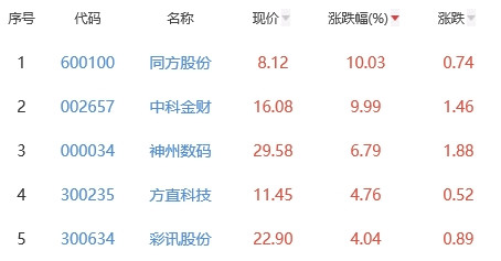 其中,同方股份、中科金财、神州数码、方直科技、彩讯股份位列板块涨幅前五位,涨幅分别为10.03%、9.99%、6.79%、4.76%、4.04%。