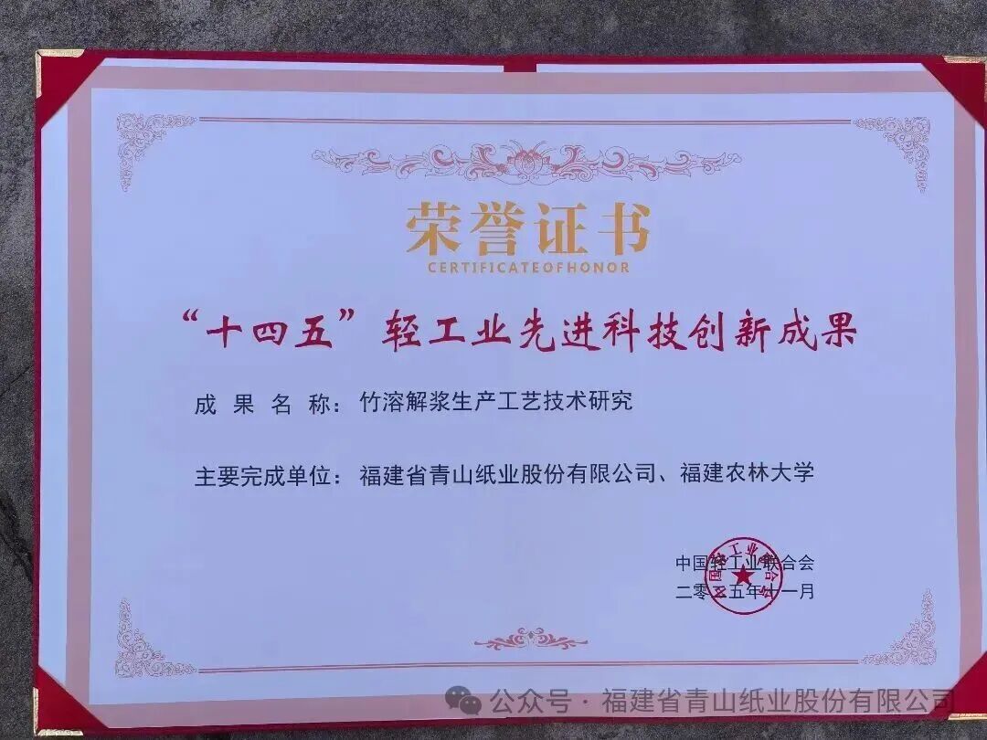 会上发布了“十四五”轻工业先进科技创新成果名单,青山纸业与福建农林大学联合研发的“竹溶解浆生产工艺技术研究”项目成功入选,彰显了公司在绿色技术创新方面的实力与成效。