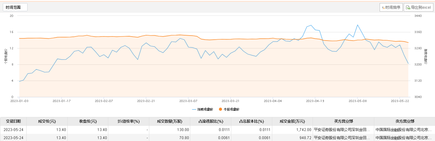 5月24日大宗交易成交200.8万股,成交额2690.72万元,占当日总成交额的8.27%,成交价13.4元,较市场收盘价13.4元持平。