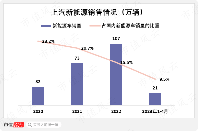 看似增长势头迅猛,但放在新能源车市大爆发的背板上一衡量,会发现上汽的新能源车市占率由2020年的23%降至2022年的16%左右,2023年1-4月进一步降至9.5%。