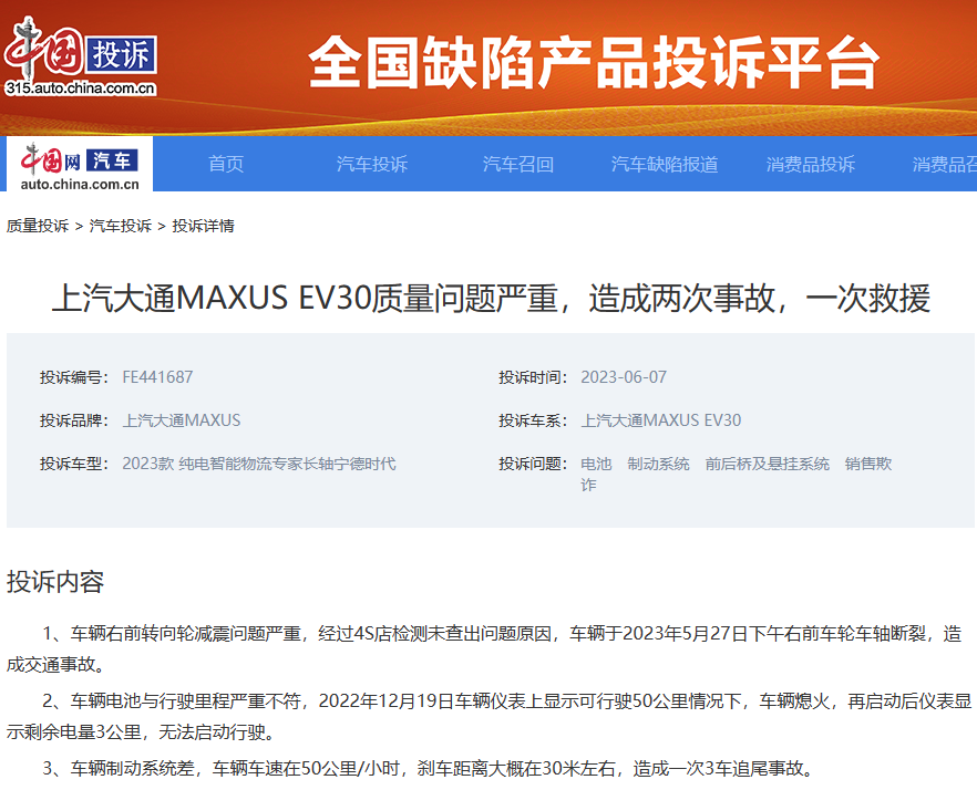 中国网汽车6月16日讯 近日中国投诉-全国缺陷产品投诉平台【进入黑猫投诉】收到了上汽大通MAXUS EV30车主潘先生有关于新车半年发生两次事故,一次救援的投诉。车主表示,今年5月车辆因右前轮车轴断裂,造成严重的交通事故,并且买车半年以来大小故障不断,车主怀疑车辆本身有质量问题。