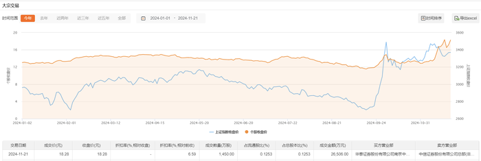 今日大宗交易成交1450万股,成交额2.65亿元,占当日总成交额的6.43%,成交价18.28元,较市场收盘价持平。