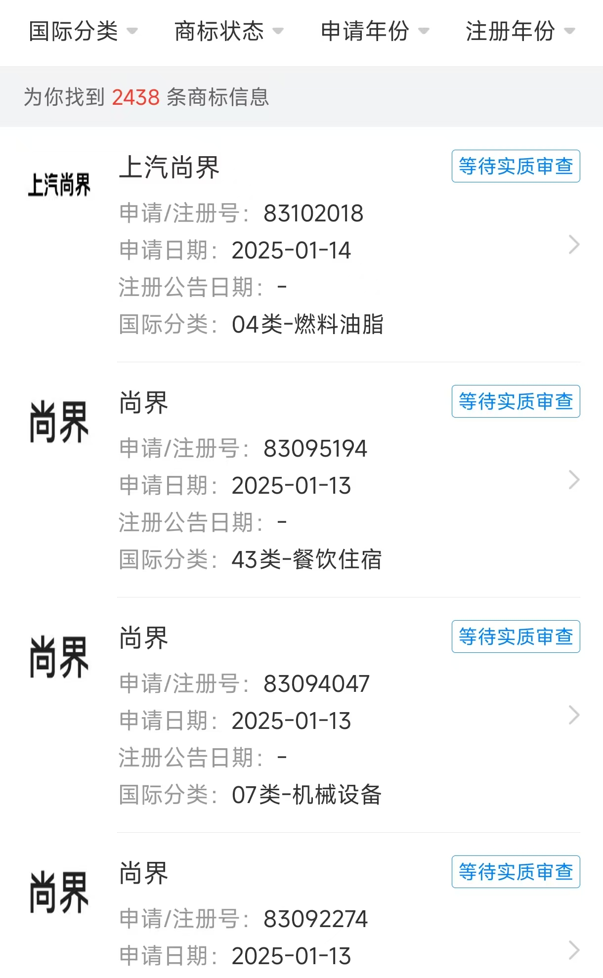 近日,上汽集团提交包括“尚界”“上汽尚界”等多个商标注册申请,国际分类包括燃料油脂、机械设备和广告销售等,商标状态均为等待实质审查。