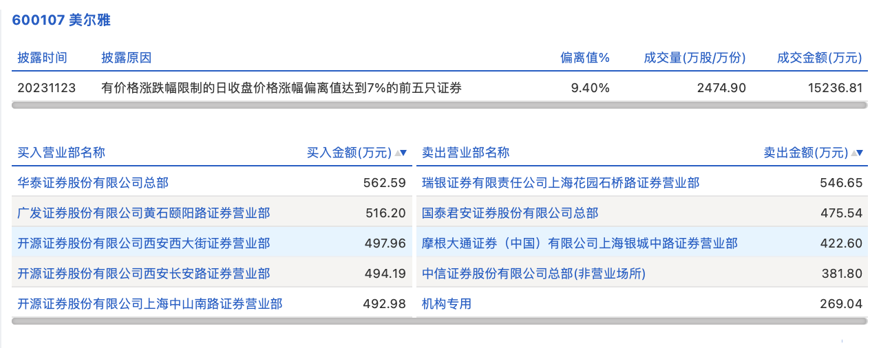 11月23日,美尔雅今日涨停,全天换手率达6.87%,振幅达10.34%。龙虎榜数据显示,营业部席位合计净买入468.28万元。其中,机构合计净卖出269.04万元。此外,华泰证券总部、广发证券黄石颐阳路证券营业部分别买入562.59万元、516.20万元;瑞银证券上海花园石桥路证券营业部、国泰君安证券总部分别卖出546.65万元、475.54万元。
