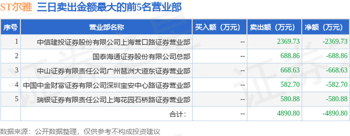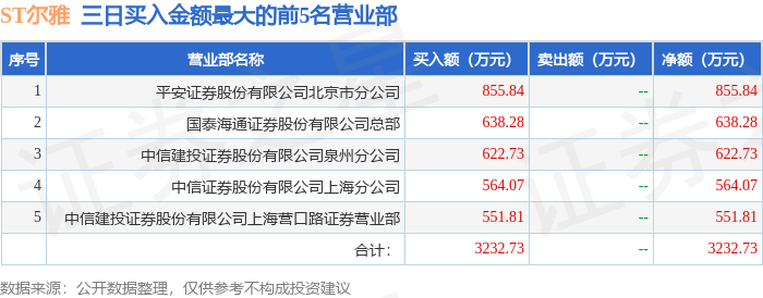 证券之星消息,沪深交易所2025年11月14日公布的交易公开信息显示,ST尔雅(600107)因ST、*ST证券连续三个交易日内收盘价格涨幅偏离值累计达到12%的证券登上龙虎榜。此次是近5个交易日内第2次上榜。