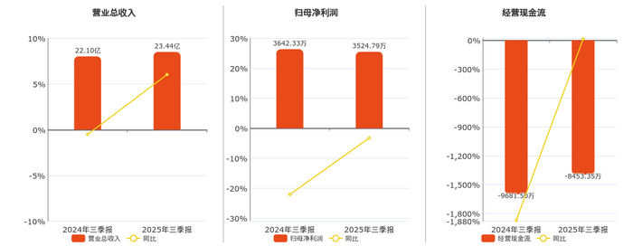 公司营业总收入为23.44亿元,在已披露的同业公司中排名第5,较去年同报告期营业总收入增加1.33亿元,同比较去年同期上涨6.03%。归母净利润为3524.79万元,在已披露的同业公司中排名第6,较去年同报告期归母净利润减少117.54万元,同比较去年同期下降3.23%。经营活动现金净流入为-8453.35万元,在已披露的同业公司中排名第14,较去年同报告期经营活动现金净流入增加1228.15万元。
