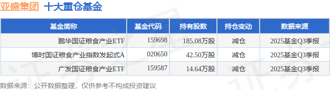持有亚盛集团最多的基金为鹏华国证粮食产业ETF,目前规模为1.79亿元,最新净值0.9877(10月30日),较上一交易日下跌0.46%,近一年上涨11.13%。该基金现任基金经理为陈龙。