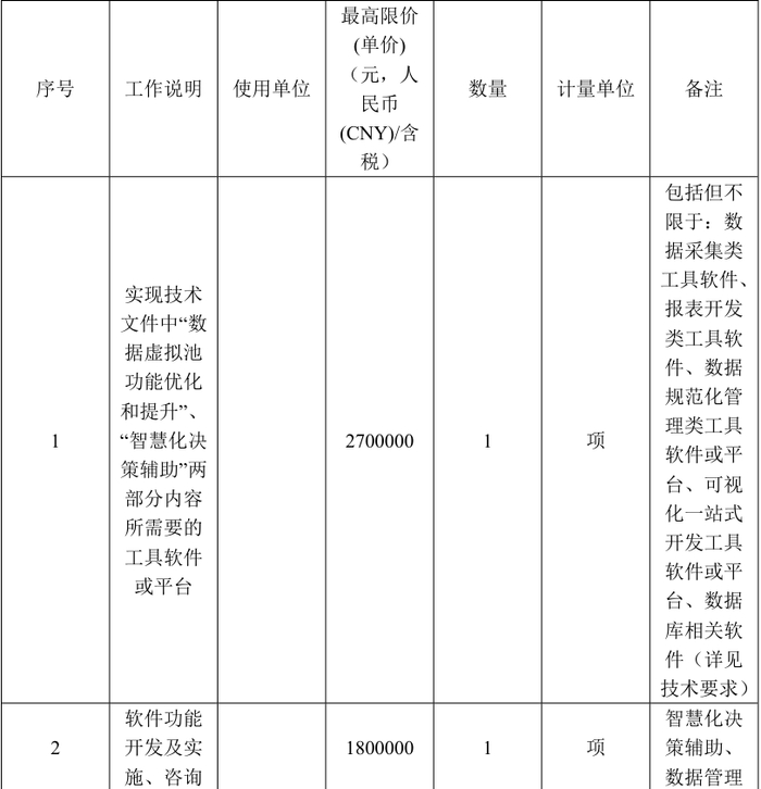 本项目招标建设内容为软件采购、部署安装及授权、功能开发实施。其中软件功能开发及实施、咨询规划税率 6%,实现技术文件中“数据虚拟池功能优化和提升”、“智慧化决策辅助”两部分内容所需要的工具软件或平台税率 13%