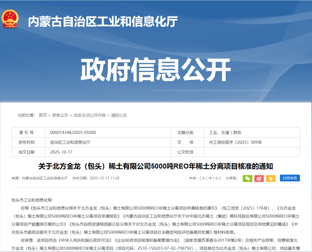 【稀土要闻】南北联手、优势互补!北方稀土又一项目获批建设