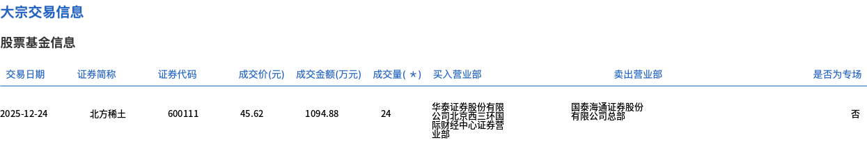 北方稀土今日大宗交易平价成交24万股,成交额1094.88万元