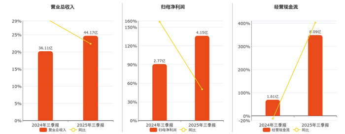 公司营业总收入为44.17亿元。归母净利润为4.15亿元。经营活动现金净流入为8.09亿元。