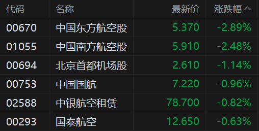 港股航空股集体走低,其中,中国东方航空、中国南方航空盘中跌超3%,中国国航跌超1%,国泰航空跌0.6%。