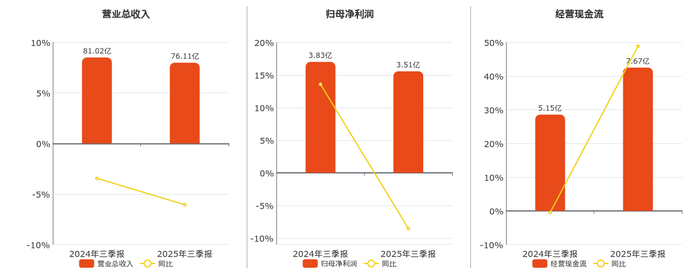 公司营业总收入为76.11亿元,较去年同报告期营业总收入减少4.91亿元,同比较去年同期下降6.06%。归母净利润为3.51亿元,较去年同报告期归母净利润减少3267.76万元,同比较去年同期下降8.53%。经营活动现金净流入为7.67亿元,较去年同报告期经营活动现金净流入增加2.51亿元,同比较去年同期上涨48.83%。