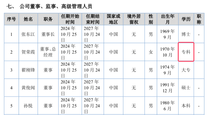 贺荣霞,1970年出生,今年56岁,专科学历,1989年8月至2014年9月,任重庆三峡水利电力(集团)股份有限公司三峡水利实业三峡水利房地产开发公司副总经理,兼任三峡水利实业发展有限公司总经理助理;2014年9月至2021年8月,担任中智诚征信有限公司创始人兼首席运营官;2021年8月至今,担任公司总经理。