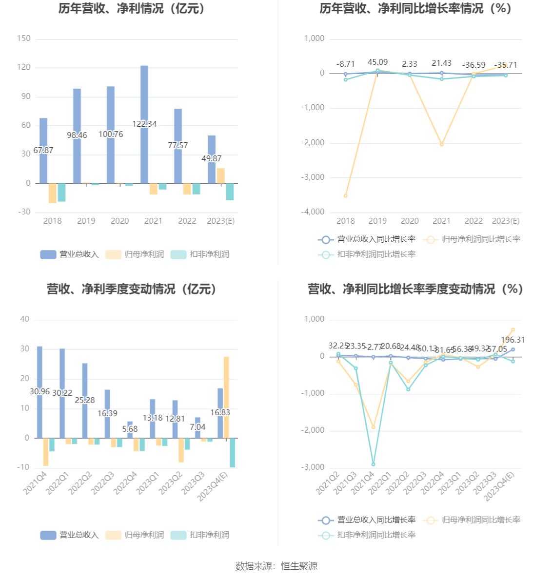 中证智能财讯 *ST西钢(600117)1月30日晚间披露2023年度业绩预告,预计2023年实现营业收入49.87亿元;归母净利润15.8亿元,上年同期亏损11.51亿元;扣非净利润亏损17.38亿元,上年同期亏损11.33亿元。以1月31日收盘价计算,*ST西钢目前市盈率(TTM)约为5.87倍。