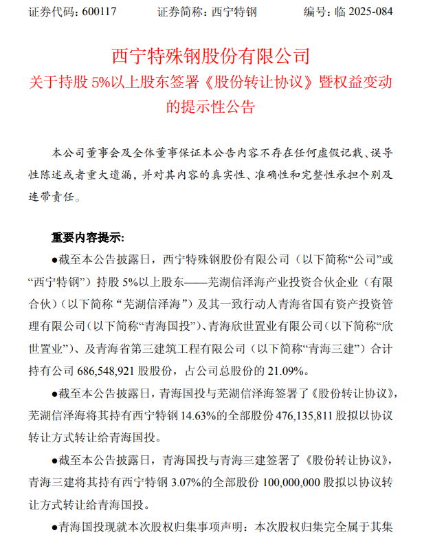 截至本公告披露日,青海国投与芜湖信泽海签署了《股份转让协议》,芜湖信泽海将其持有西宁特钢14.63%的全部股份476,135,811股拟以协议转让方式转让给青海国投。