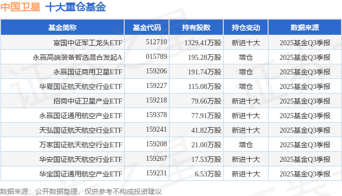 持有中国卫星最多的基金为富国中证军工龙头ETF,目前规模为146.9亿元,最新净值0.7123(10月29日),较上一交易日上涨0.49%,近一年上涨6.47%。该基金现任基金经理为王乐乐 牛志冬。