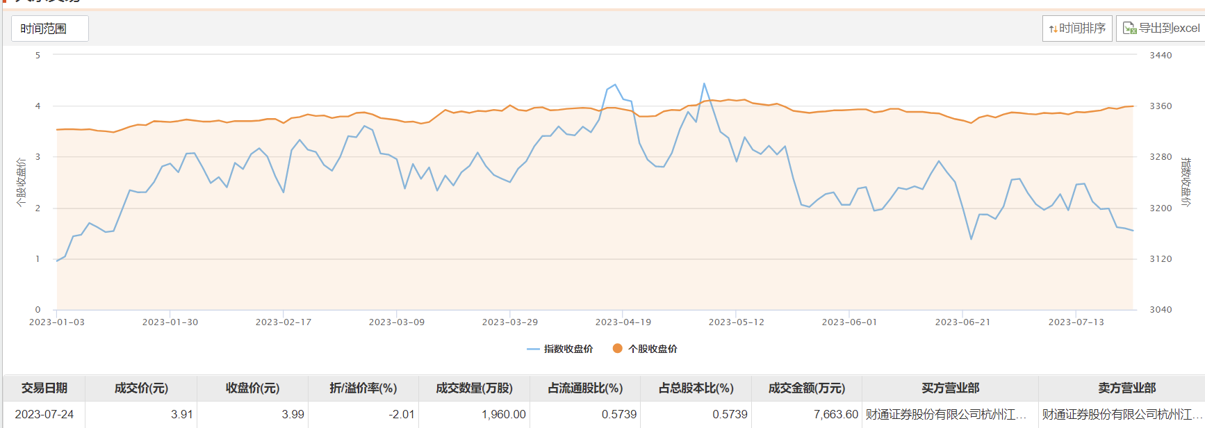 7月24日大宗交易成交1960万股,成交额7663.6万元,占当日总成交额的52.43%,成交价3.91元,较市场收盘价3.99元折价2.01%。