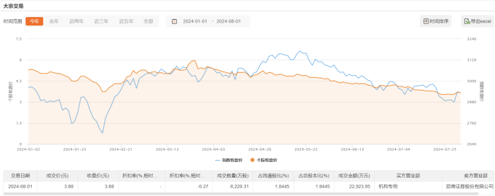 今日大宗交易成交6229.31万股,成交额2.29亿元,占当日总成交额的74.35%,成交价3.68元,较市场收盘价持平。