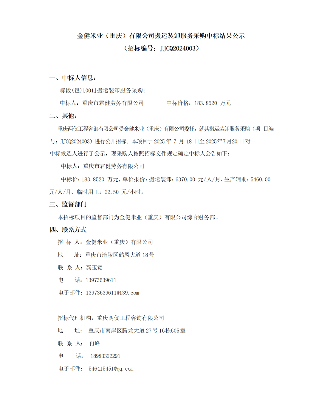 金健米业(重庆)有限公司搬运装卸服务采购中标结果公示