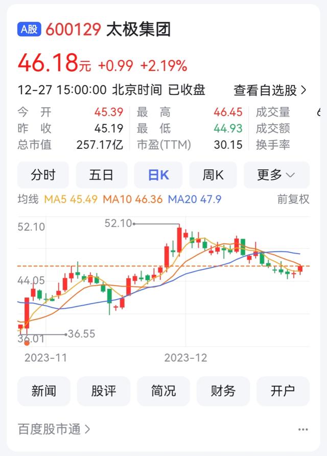 12月27日,太极集团报收46.18元,涨2.19%,换手率1.16%,市盈(TTM)30.15,总市值257.17亿元,今年累计涨幅53.63%。