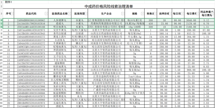 图片来源:天津市医药采购中心挂网表格截图蓝鲸新闻11月28日讯(记者 屠俊)近日,天津市医药采购中心发布《关于开展药品价格风险治理工作的通知》,针对部分挂网价格与日均治疗费用价差较大的中成药展开价格治理,要求相关企业主动开展价格自查,并将价格调整至合理区间。