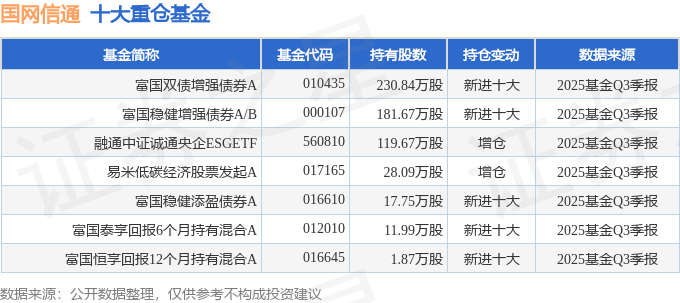 持有国网信通最多的基金为富国双债增强债券A,目前规模为27.8亿元,最新净值1.1473(10月30日),较上一交易日下跌0.23%,近一年上涨7.62%。该基金现任基金经理为俞晓斌。