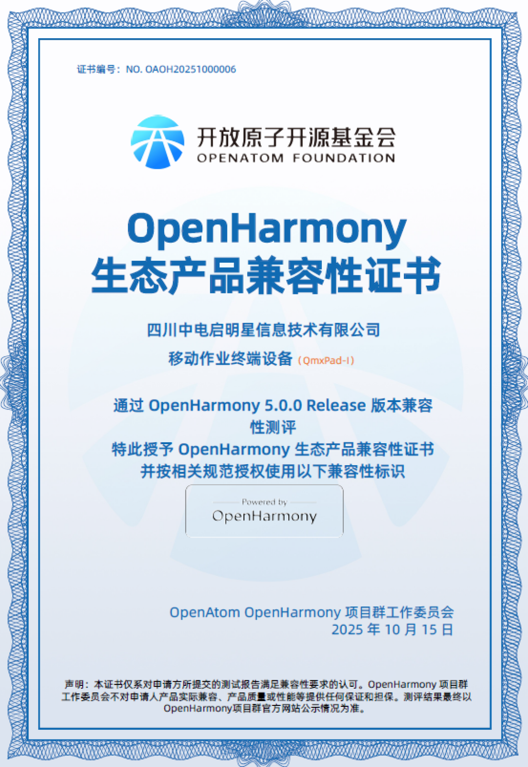国网信通股份中电启明星“星鸿EOS”电网移动作业终端取得开源鸿蒙XTS兼容性认证证书